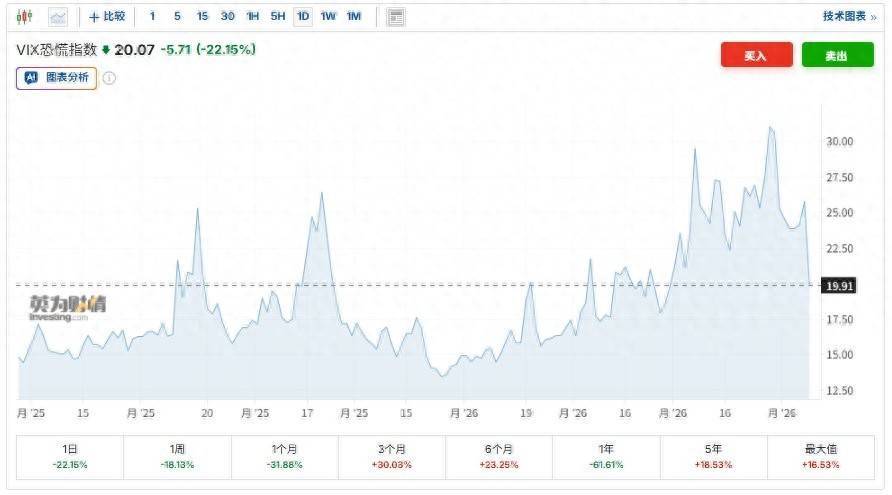 智通财经APP获悉,随着美伊双方在最后时刻达成临时停火协议配资论坛资讯,被誉为市场“恐慌指数”的芝加哥期权交易所波动率指数(Cboe Volatility Index)暴跌22.15%(5.71点)至20.07点,创2月27日美国发动攻击前以来的最低水平。若跌势得以维持,这将是自特朗普一年前暂停关税计划(该计划曾引发全球市场动荡)以来最大的单日跌幅。据悉,该指数是衡量未来一个月股市预期波动程度的指标。