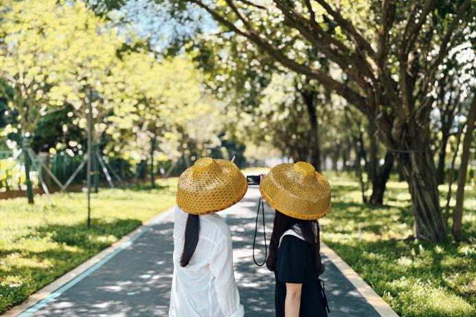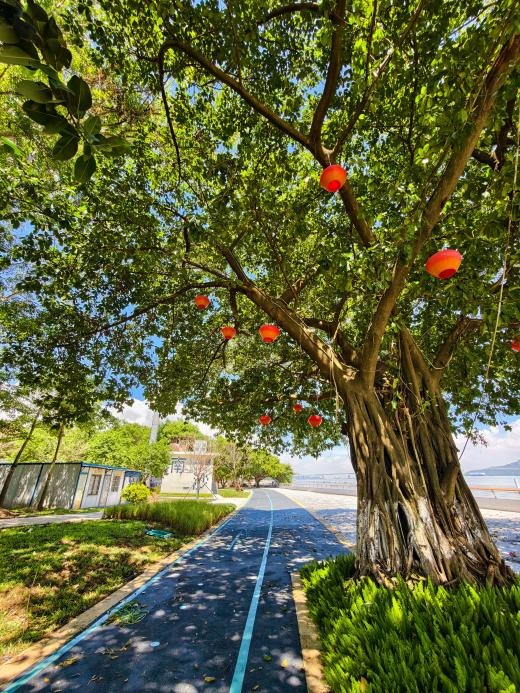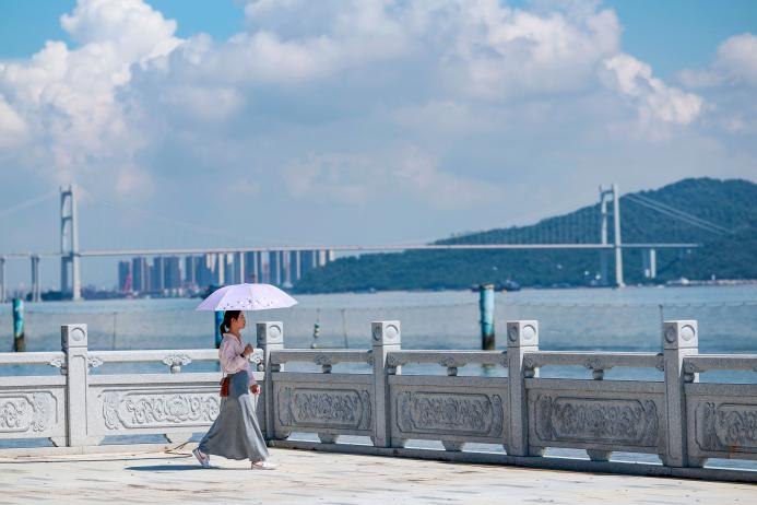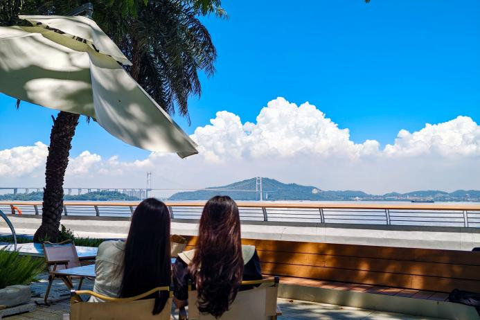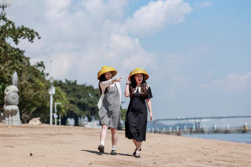 白色的墙面上印有蓝色像素风格的“南沙”和“NAN SHA” 字样,与慢行道边的蓝色海水相互映衬,展现出南沙与蓝色海洋的亲密关系。