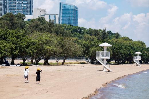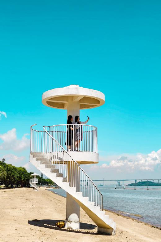 瞭望台的通体白色、结构独特,螺旋形的楼梯有独特的空间美感,在大片黄色沙滩和蔚蓝海水中显得“特立独行”,与瞭望台合影,轻轻松松“出大片”。