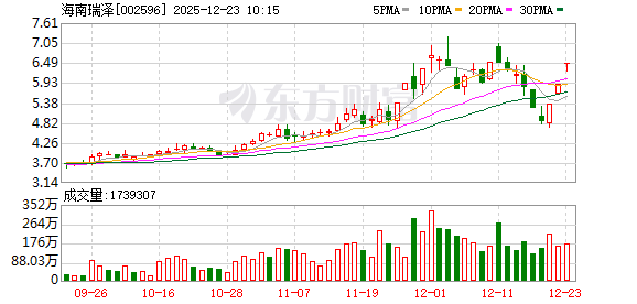 海南瑞泽盘中涨停,已连收3个涨停板,截至9:25,该股报6.48元,换手率1.17%,成交量1342.20万股,成交金额8697.46万元,连续涨停期间,该股累计上涨33.33%,累计换手率为34.45%。最新A股总市值达74.36亿元,A股流通市值74.29亿元。