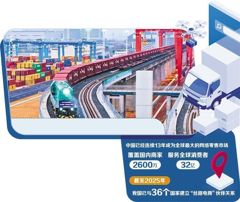 在全球舞台,电子商务的开放合作篇章同样精彩。截至2025年,我国已经与36个国家建立“丝路电商”伙伴关系,朋友圈遍及五大洲,我国跨境电商进出口额占货物进出口比重超6%,开放合作持续深化。