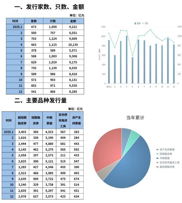 数据显示,2025年12月份银行间债券市场共发行债务融资工具866只,金额8285亿元。其中,超短融2978亿元、短融627亿元、中票3573亿元、定向债务融资工具423亿元、资产支持票据634亿元。2025年全年,银行间债券市场共发行债务融资工具11531只,金额10.09万亿元。