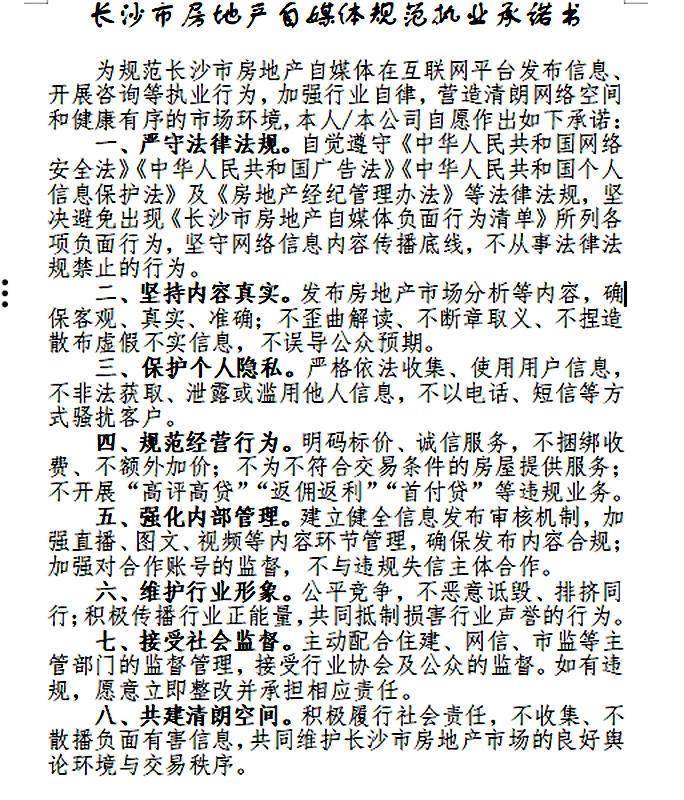 会议现场2026年1月,长沙市住房和城乡建设局联合长沙市市场监督管理局、长沙市互联网信息办公室等部门,在长沙市范围内集中开展规范房地产领域平台及自媒体行为联合整治行动。行动明确三大整治对象:涉房自媒体账号、房地产网络信息平台、房地产经纪机构。针对本领域乱象,重点整治五类行为:一是违规经营行为,重点核查房地产经纪机构是否具备相应资质并备案,房地产经纪服务个人是否办理实名登记;二是发布虚假房源信息网上平台配资,包括不实房源信息、隐瞒抵押查封信息、已售房源继续挂牌等情况;三是违规宣传解读政策网上平台配资,虚假承诺学区或规划用途、使用“稳赚不赔”等表述、歪曲政策走势;四是恶意营销炒作,滥用“秒杀”“抢购”等描述制造恐慌、蹭炒教育房产热点;五是无证经营、违规收费等其他行为。依托线上数据监测平台,本次行动将“房价暴跌”“绝对升值”“火速抄底”等关键词纳入监测词库,对抖音、小红书、快手、微信视频号、本地房地产平台等进行监测,累计排查监测各类关联账号6000余个,筛查信息1.1万余条;线下组建2个联合检查组,对全市33个头部、部分涉房自媒体账号开展实地核查,重点核验运营主体资质、房源备案信息、从业人员资质及宣传资料真实性,督促长沙市3大主要房地产信息平台开展从业行为规范自查。同时,畅通12345热线、政务信箱等投诉渠道,受理群众举报线索10条,建立清单化管理、销号式整改台账。组织5场政策宣讲进自媒体活动,对深耕涉房自媒体领域从业人员开展政策宣贯,引导其通过长沙市房屋交易一体化服务平台(官方房源信息平台)进行线上核验备案。“经过阶段性攻坚,整治行动取得显著成效,有效遏制了行业乱象。”长沙市房屋交易管理中心相关负责人介绍,全市3大主要房地产信息平台,对旗下企业及从业人员运营的房地产类账号信息(含账号名称、运营主体、负责人等)进行了梳理登记建档。建立了发布内容内审和随机抽检机制,经纪机构房源核验备案率大幅提升,不实承诺、无证经营等行为大幅减少,消费者投诉量同比下降。本次通报会共有40余家涉房自媒体账号、房地产网络信息平台、房地产经纪机构相关负责人参加会议并签订了《长沙市房地产自媒体规范执业承诺书》。会上,长沙市房地产中介协会发布《长沙市房地产自媒体负面行为清单》,明确了20条禁止性规定,并通报了专项整治典型案例。相关链接:《长沙市房地产自媒体规范执业承诺书》