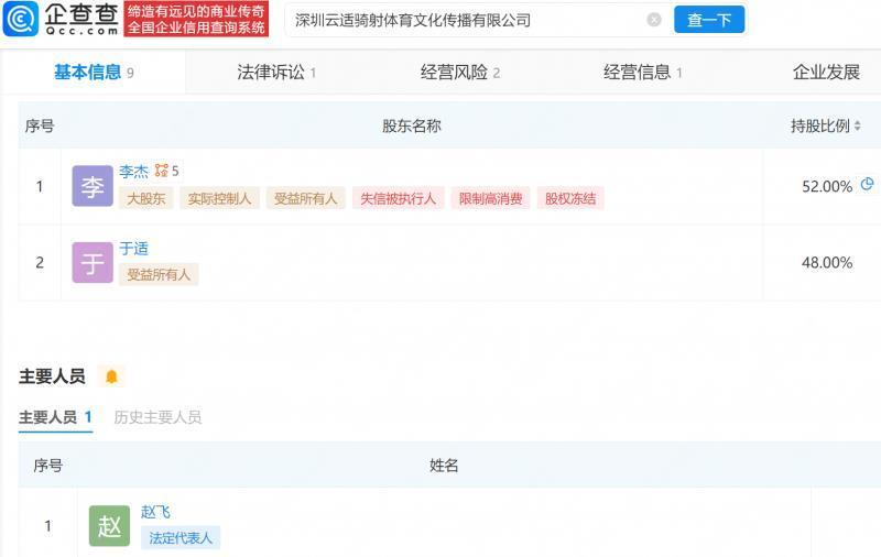 企查查APP显示,近日,深圳云适骑射体育文化传播有限公司因未按规定期限公示年度报告,被深圳市市场监督管理局龙岗监管局列入经营异常名录。该公司成立于2024年10月,法定代表人为赵飞,注册资本为750万元,经营范围包含体育赛事策划、体育竞赛组织、组织体育表演活动等,由李杰、于适分别持股52%、48%。